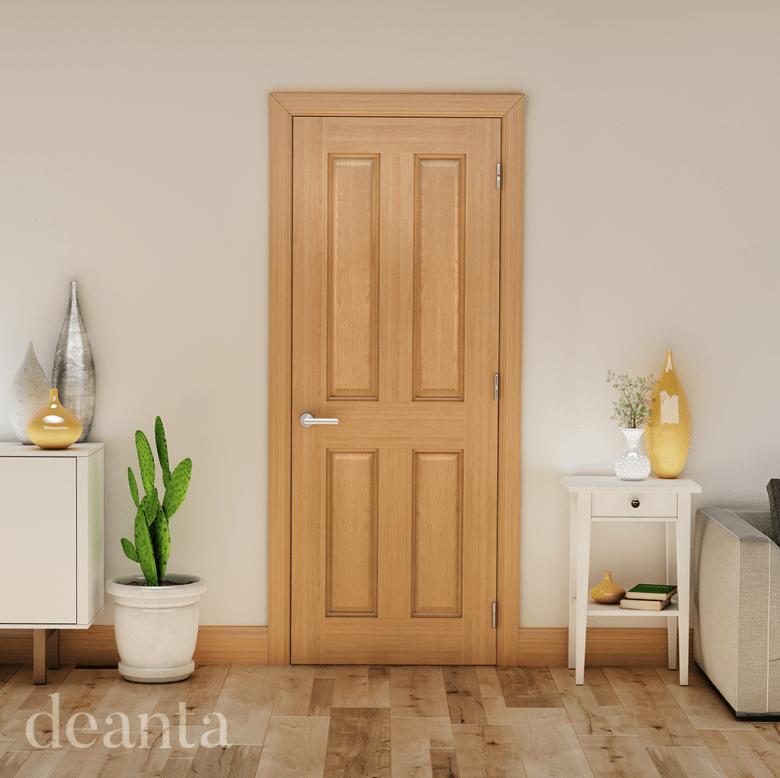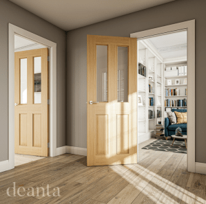 The neatly symmetrical Bury door by Deanta features four bevelled-edge panels of crown cut oak veneer, it’s a versatile choice that complements any room in any home. Also available in a clear glazed option – ideal for creating light-filled spaces while maintaining a coordinated look.